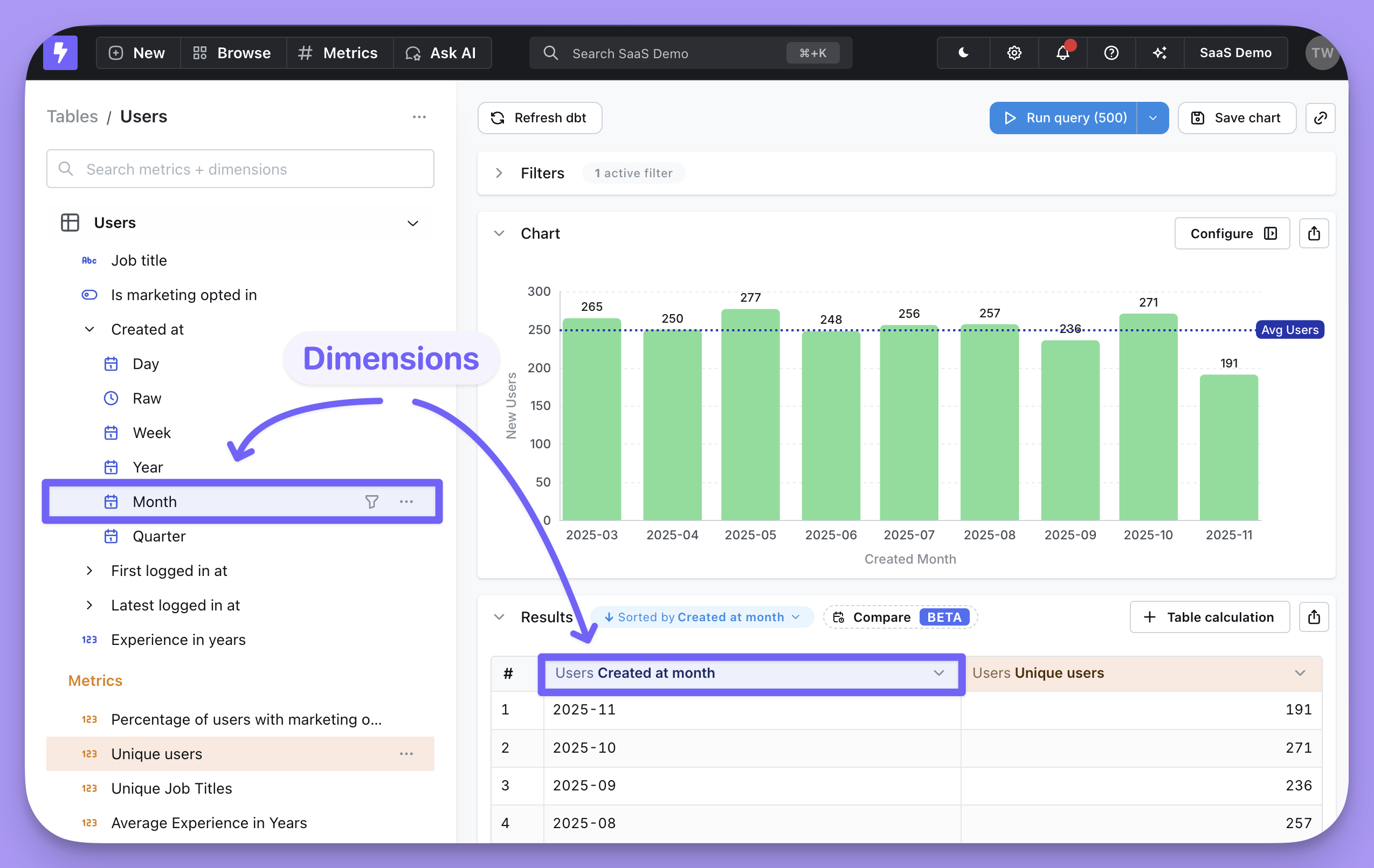 The name of the dimension is source and the type will be inferred from the column in your database. You can see the full list of dimension types supported in Lightdash here. Once you’ve added your dimensions, you can use them in Lightdash to build charts and filter results. Dimensions appear in the Explore view, above metrics and, if selected, pop us as blue fields in your results table.