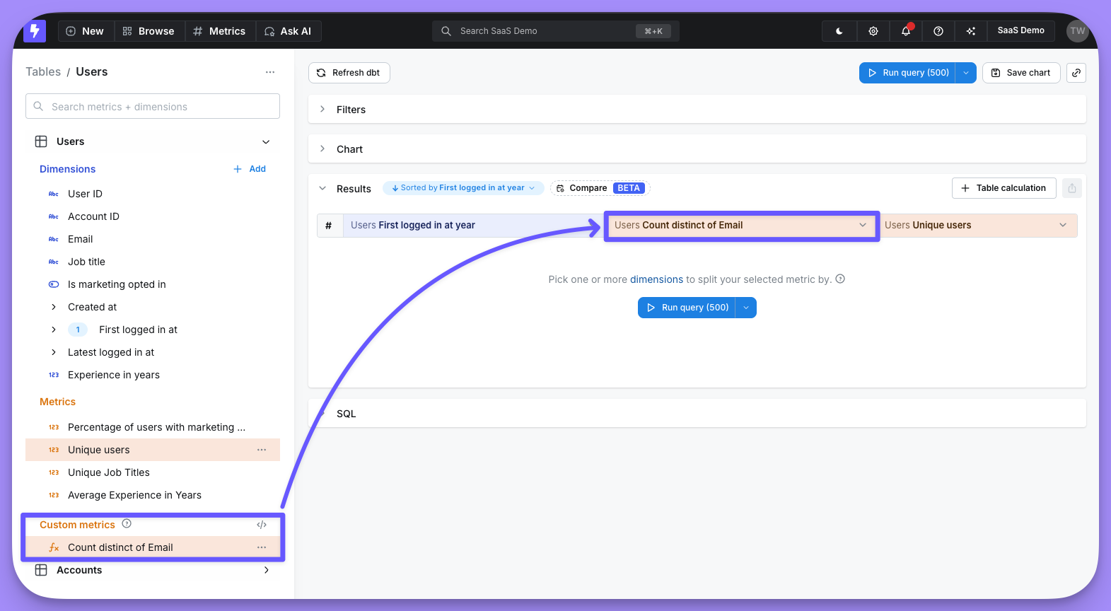 Custom metrics are only saved in the chart they’re used in and will not be saved in the list ofmetrics available if you open the same Table to build a new chart. Metrics written to your dbt project (or YAML metrics) are reusable by everyone in your project and will always show up in the side bar of available metrics for a Table. We recommend writing back custom metrics that you’re using/creating frequently so they become reusable, governed and available for everyone else to build from.