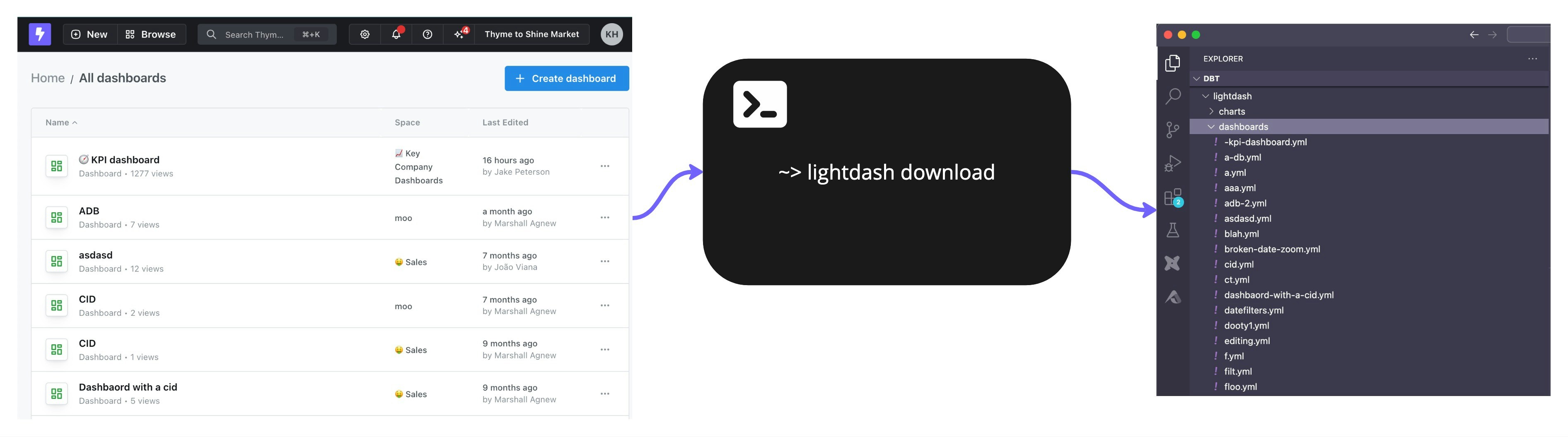 • Download dashboards and charts as YAML using lightdash download