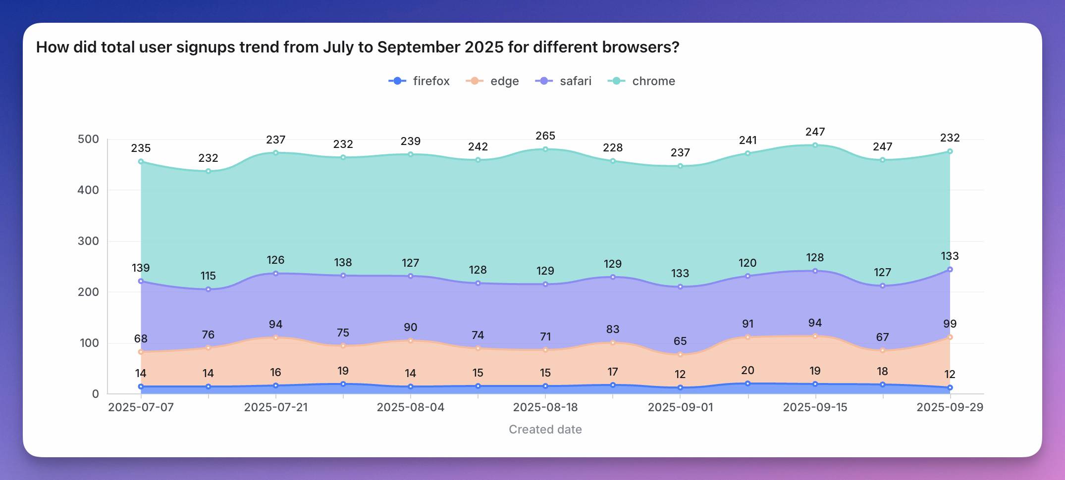 • you’re showing multiple series over time. If you just want to show one value over time, also consider a line chart instead; especially if you don’t want your y-axis to start at zero. If you only have a few dates, you can also consider using a column chart. In both cases, labelling will be better.