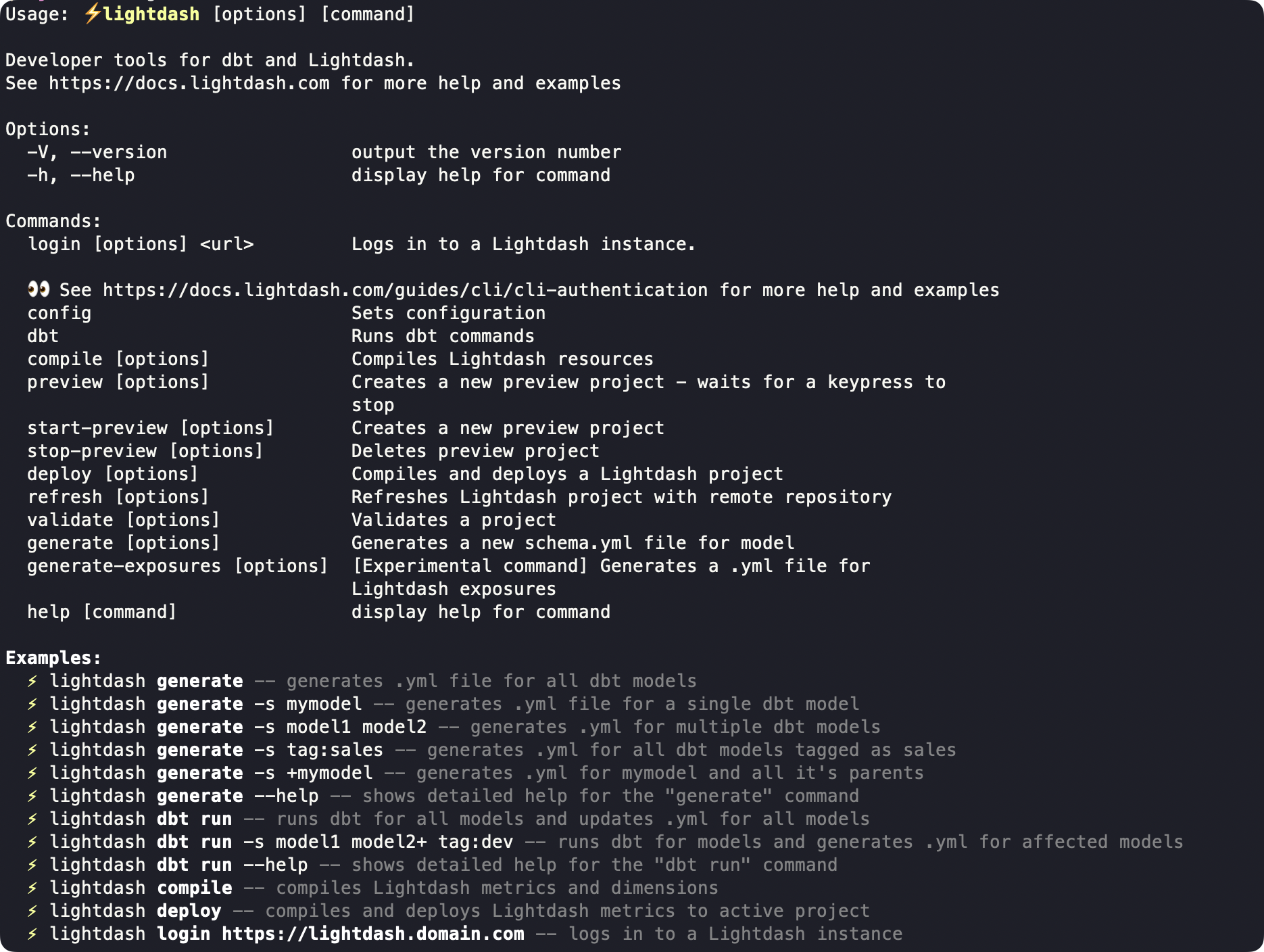Tells you what the preceding command does and lists all command-specific options. You can view the Lightdash CLI help like this: