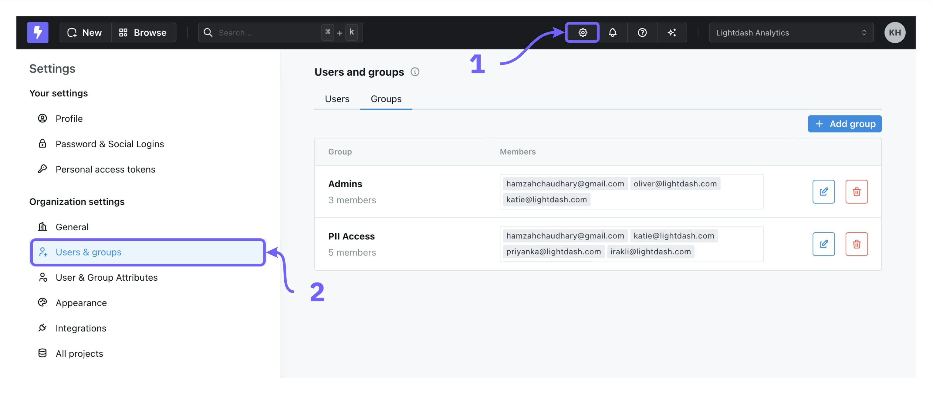 Groups are only available on Lightdash Cloud Pro and Enterprise plans.For more information on our plans, visit our pricing page.